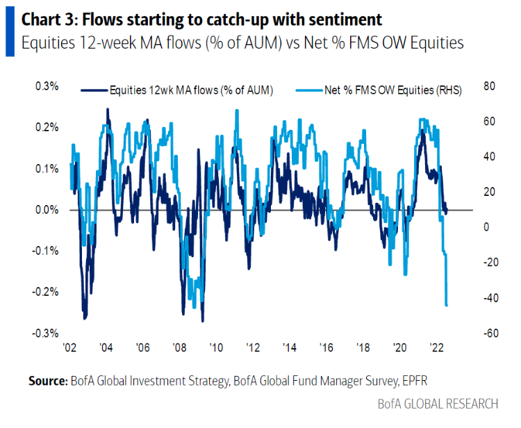 美銀援引EPFR Global的數據指出,投資者已經從全球股票型共同基金撤資至少五周,在最近一段時間內撤資45億美元。該行策略師來説,這表明資金流出正在追趕市場的悲觀情緒。在該銀行的全球基金經理調查中,創紀錄的58%的調查參與者表示他們承擔的風險低於正常水平。