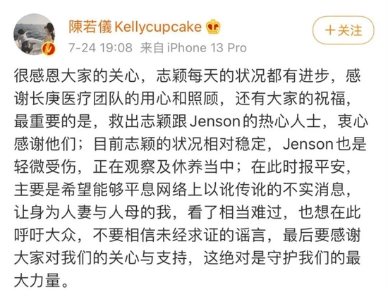 林志穎妻子陳若儀剛剛在微博發文表示很感恩大家的關心,並表示目前林志穎的狀況相對穩定,Jenson也是輕微受傷。