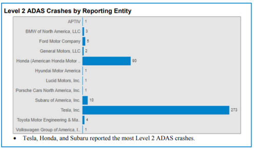 有趣的是,美國公路交通安全管理局(NHTSA) 曾在6月15日發佈一篇關於自動駕駛輔助汽車事故報告,該局統計了自2021年7月至2022年5月15日關於配備L2級自動駕駛輔助車輛的事故數據。數據顯示,這期間共發生392起事故,其中特斯拉佔據了當中的273宗,佔比直達近70%。