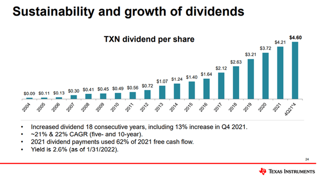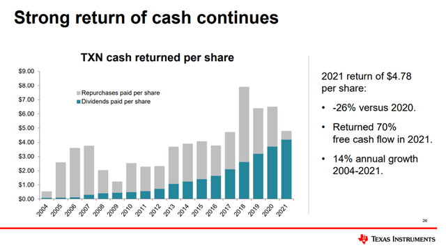 德州儀器擁有完美的投資資本回報率記錄,遠遠超過同行,通過在10年和20年的時間內擊敗標準普爾500指數,為股東帶來了巨大的利益。從2004年到2021年,連續18年股息增長,年複合增長率為25%,同時在同一時期減少了46%的股份。這個管理團隊與它的股東基礎一致,回報率說明了一切,但絕不是對未來回報率的承諾。
