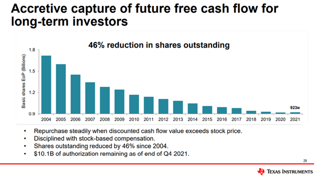 在股票回購方面,管理層不會盲目行動,他們會選擇時機,這里也有解釋。考慮到德州儀器在過去一年的高估值,我很高興看到管理層在2021年有所收斂,這也可以在本節的第一個插圖中看到。這是在兩位數的十億授權活躍的時候。現在,這就是照顧股東和謹慎使用你的資本。