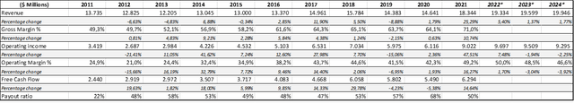 從上表可以看出,2011年至2020年,營收僅增長6.6%,但隨后半導體的缺乏打擊了市場,加上該公司正在進行的投資,這意味着營收進一步增長,從2020財年至2021財年同比增長25%。因此,由於2020財年至2021財年之間的一次大幅躍升,2011 - 2021財年的收入增長了35.9%。