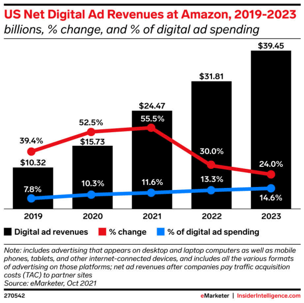 在21財年,該公司報告的廣告收入為312億美元。這比2020年增長了58%,比2019年增加了146%。上個季度,AMZN的廣告收入為79億美元。這代表了25%的同比增長。亞馬遜的廣告業務是美國第三大在線廣告服務,僅次於Alphabet(GOOG)(GOOGL)Google和Meta(META)。