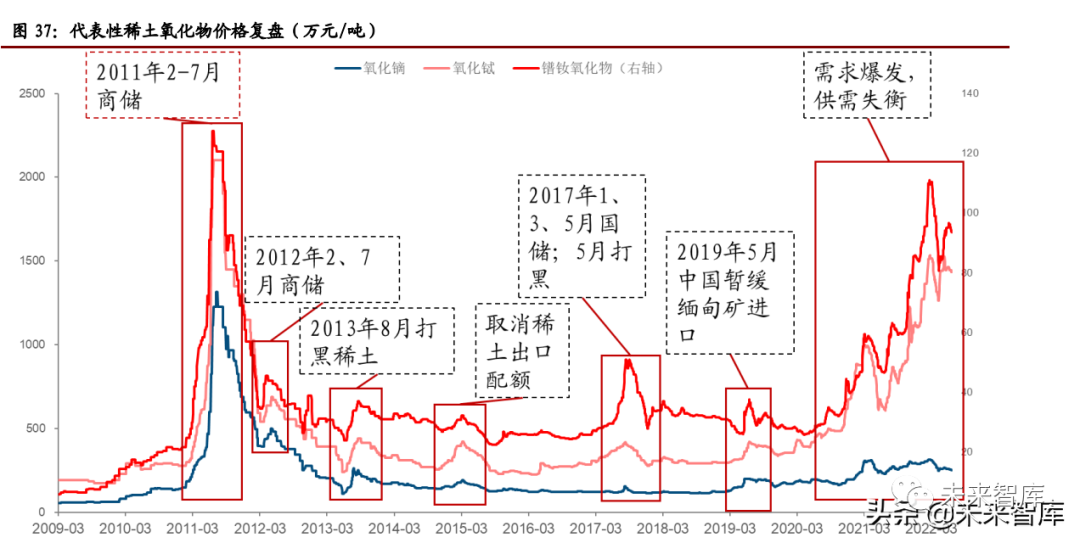 覆盤稀土價格歷史走勢,過去曾出現過 6 次明顯上漲:(1)2010 年 12 月 31 日 -2011 年 8 月 16 日:氧化鐠釹價格從 21.0 萬元/噸衝到歷史最高點 120.5 萬元/ 噸,漲幅高達 475.2%,主受 2011 年 2 月至 7 月第一次商儲預期的刺激,同時也 受到 2010 年 10 月加徵釹鐵硼等關税的影響;(2)2012 年 3 月 6 日-2012 年 4 月 18 日:氧化鐠釹價格從 34.5 萬元/噸上漲至 45.5 萬元/噸,漲幅 31.9%,2012 年 2、7 月商儲的刺激影響趨弱;(3)2013 年 6 月 21 日-2013 年 8 月 27 日:氧 化鐠釹價格從 24.0 萬元/噸上漲至 37.0 萬元/噸,漲幅 54.2%,主受 2013 年 8 月打黑的預期影響;(4)2014 年 11 月 24 日-2015 年 3 月 16 日:氧化鐠釹價格從 27.0 萬元/噸上漲至 32.3 萬元/噸,漲幅 19.4%,2015 年 1 月商務部取消出口配 額帶來了短暫行情;(5)2017 年 3 月 8 日-2017 年 9 月 6 日:氧化鐠釹價格從 27.2 萬元/噸上漲至 51.0 萬元/噸,漲幅 87.8%,國儲疊加打黑預期下刺激價格;(6)2019 年 5 月 16 日-2019 年 6 月 19 日:氧化鐠釹價格從 26.2 萬元/噸上漲 至 37.8 萬元/噸,漲幅 44.4%,緬甸礦進口受限短暫抬升價格。