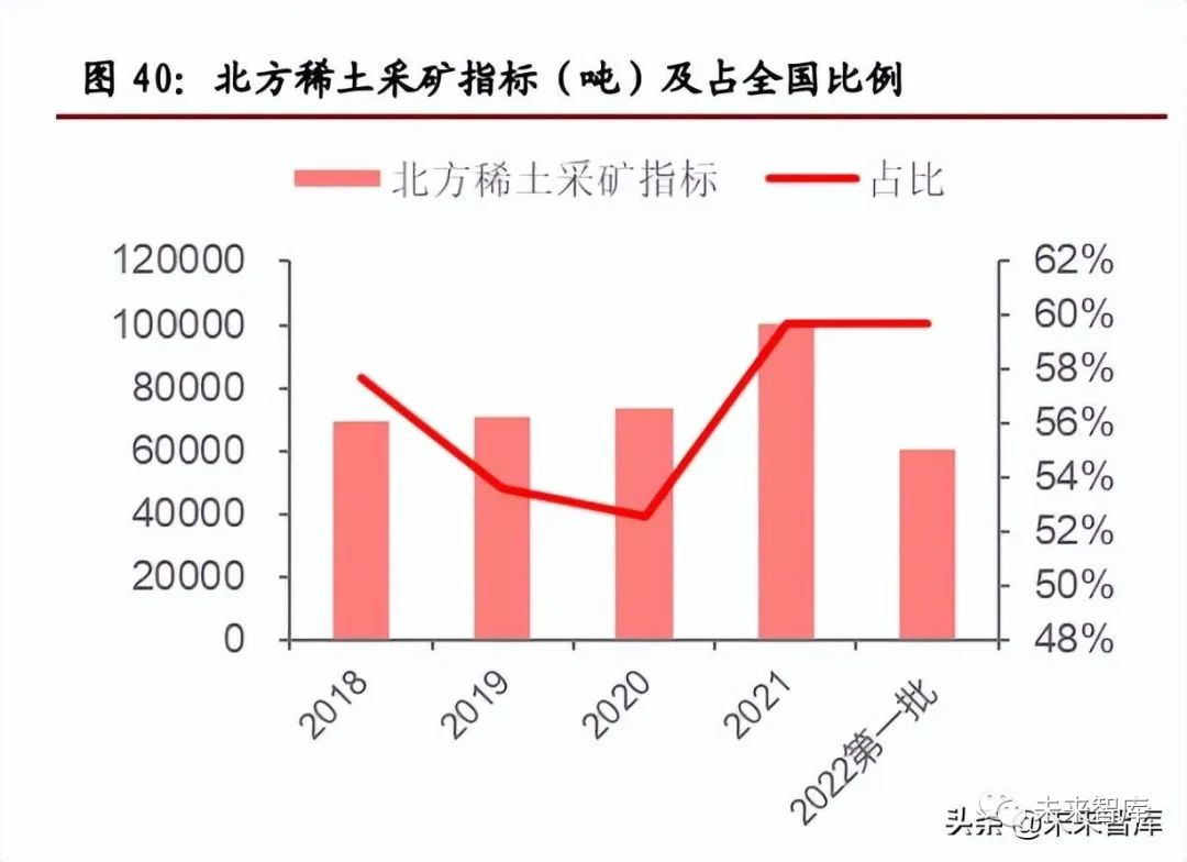 全球最大輕稀土供應商,政策傾斜享受稀土高景氣。依託資源優勢,2018-2022 年公司稀土礦/冶煉分離生產指標始終為全國第一,同時 2021 年起輕稀土配額增 量向公司傾斜佔比回升。產量指標增長下,公司業績有望充分享受行業高景氣帶 來的提升。