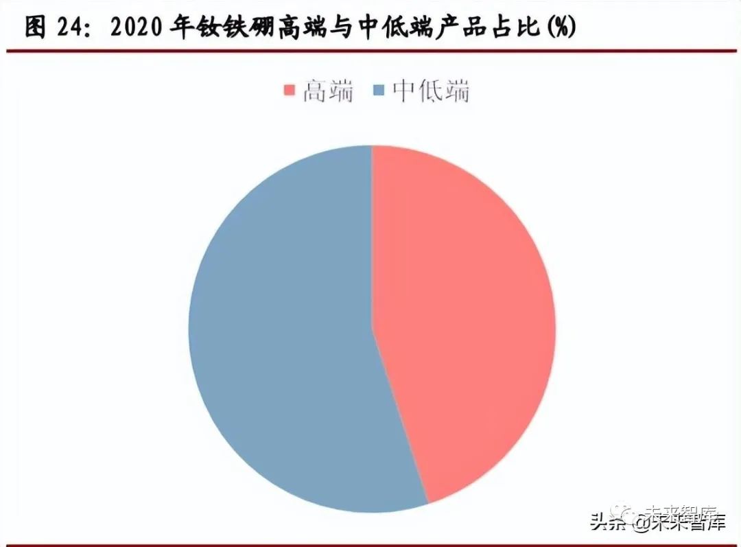 稀土下游廣泛,其中稀土永磁材料是需求最大、消費價值最高的領域,稀土鐠釹 主要用於製造第三代稀土永磁材料釹鐵硼。釹鐵硼下游同樣較為分散,其中 2020 年高性能釹鐵硼佔比約 45%,被廣泛應用於新能源汽車、風電、節能環保等新興 產業中,新能源浪潮下成長空間巨大;中低端釹鐵硼主要應用於箱包扣、門扣、玩具、磁選等傳統領域。