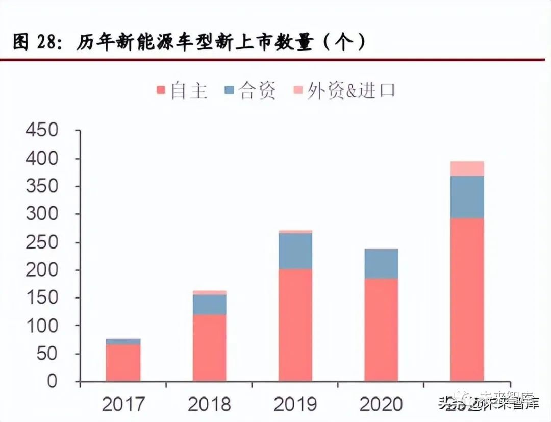優質供給點燃 C 端需求。雖然 2020 年受疫情影響,新能源市場產品投放數量有 所放緩,但隨着疫情緩和以及車市利好信息不斷,2021 年產品投放數量回升, 2021 年全年新能源乘用車上市車型 396 個創近 5 年新高,優質新能源車產品獲 得市場認可,明星車型不斷涌現,C 端需求打開新能源車需求天花板。