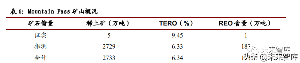 美國 Mountain Pass 基本滿產,我國企業參股包銷。Mountain Pass 是美國最大 的在產礦山,礦石儲量為 2733 萬噸,平均品位約 6.34%,REO 儲量為 183 萬噸。礦山設計產能為 4 萬噸 REO,此前一直處於停產,2017 年 7 月 MP Materials 收 購 Mountain Pass 並在 2018 年復產,2020 年產能爬坡達到基本滿產,短期無擴 產規劃。盛和資源基於全球化佈局角度參股 MP Materials,間接持有其約 8%的 股份,MP Materials 不具備稀土加工的能力,其稀土產品直接包銷給盛和資源, 我們認為在冶煉分離能力的加持下,未來我國企業有望通過佈局海外稀土資源鞏 固資源端優勢。