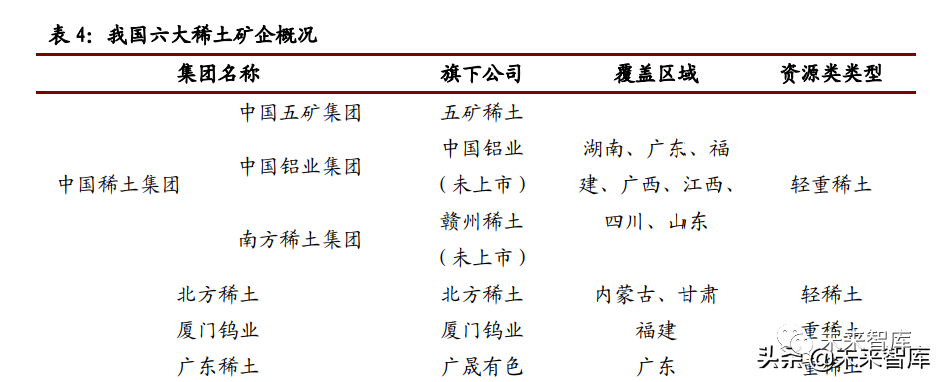 六企主導供給,格局有望進一步優化。稀土企業間的惡性競爭導致互相壓價,同 時喪失對下游的議價權。2016 年我國確定了以北方稀土、南方稀土、中鋁公司、 廣東稀土、五礦稀土和廈門鎢業六大國企為主導的行業競爭格局。2021 年底我國 宣佈成立以中鋁公司、五礦稀土、贛州稀土三大稀土集團為主體的「中國稀土集 團」,並同時引入中國鋼研科技集團有限公司,有研科技集團有限公司兩家稀土科 研技術研發企業,以實現稀土資源優勢互補、稀土產業發展協同,保證我國管控 分散的中重稀土供給,我國供給格局有望進一步優化。