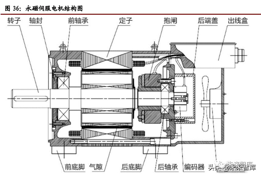 永磁伺服電機是工業機器人關鍵零部件。在自動化工業機器人和自動化單元之 間,伺服電機將機構按照控制指令的要求準確、及時、穩妥地傳送到位的關鍵作 用,屬於核心零部件。由於稀土永磁材料直接產生勵磁磁場,不存在需要勵磁電 流建立電機磁場的過程,故電磁響應快,且高能量密度使得永磁伺服電機功率密 度高,為進一步設計成各種特性的伺服電機提供了可能,稀土永磁材料的特性使 永磁電機成爲了伺服電機的首選。