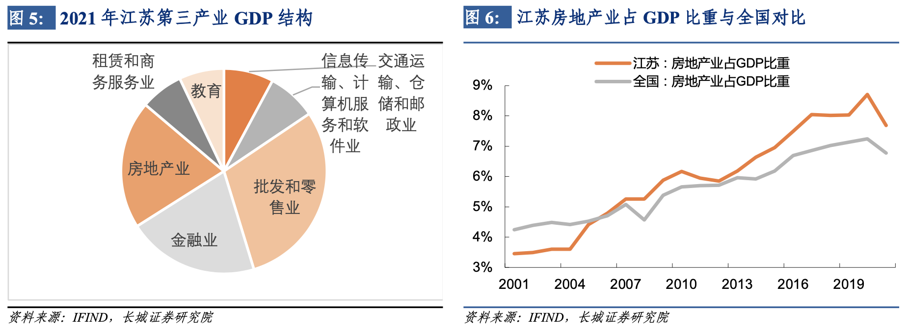 江蘇省第三產業佔GDP比重基本呈現逐年上升趨勢,從2012年的43.1%升至2020年的52.5%,2021年第三產業比重小幅回落至51.4%。批零業、金融業、房地產業佔據江蘇省第三產業的前三名,其中房地產對江蘇經濟拉動作用逐漸增強。近20年來,江蘇房地產增加值佔GDP比重不斷上升,從2001年的3.5%增長至2020年的8.7%,2020年江蘇房地產業增加值增速為12.9%,比全國高出7.1個百分點。2021年江蘇房地產業同比增速放緩至0%左右,但房地產業增加值佔全國比重達11.5%,依然高於江蘇GDP佔全國比重(10.2%),對全省的經濟影響較大。
