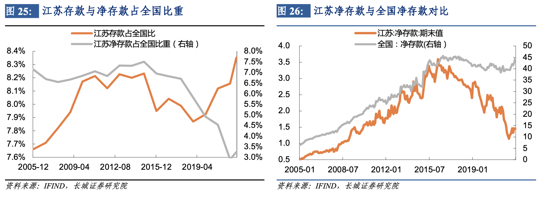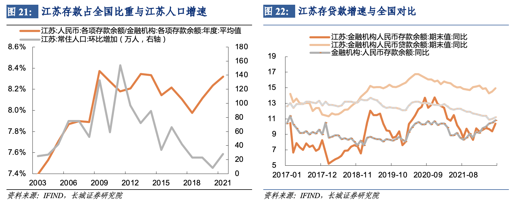 2003年-2009年,江蘇省對資金的吸引與對人口的吸引比較一致,江蘇省金融機構人民幣存款余額佔全國比重從7.4%快速上升至8.4%,這同時也是江蘇省人口快速增長的一段時期。2010年-2018年,江蘇人口增速放緩,江蘇省存款佔全國的比重也有了緩慢下滑趨勢。2018年至今,雖然江蘇省人口增速仍處於下降趨勢,但江蘇存款佔全國比重再次上升,截至今年6月這一比重上升至8.4%,我們認為可能是企業融資大幅上升拉動的。