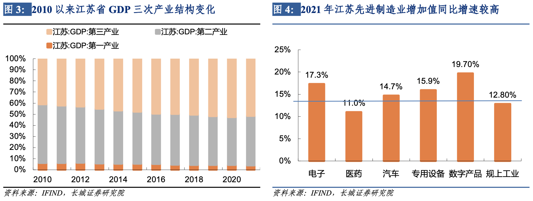 江蘇省工業不僅根基穩固,並且維持較高增速。去年江蘇規模以上工業增加值增長12.8%,增速遠超全國水平,這其中製造業生產貢獻了工業生產的重要部分。江蘇省先進製造業增勢良好,產業不斷向中高端邁進。江蘇統計局數據顯示,2021年高技術產業、裝備製造業增加值同比增速分別為17.1%和17.0%。高新技術產業產值與戰略性新興產業產值分別佔規上工業比重達到47.5%和39.8%。