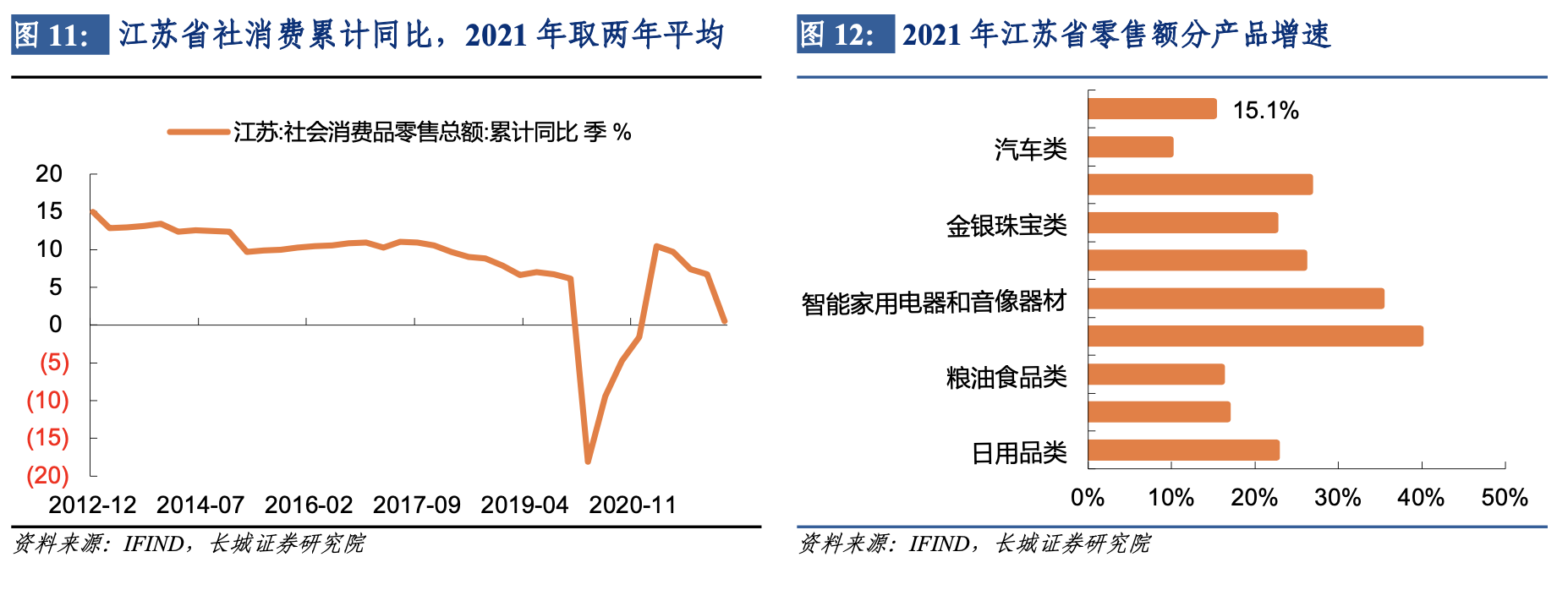 消費方面看,江蘇省消費潛力逐步釋放,消費結構不斷改善。2021年江蘇省城鎮居民人均可支配收入從2012年的2.97萬元增長到5.8萬元,比全國平均水平高1.1萬元。社會消費品零售總額從2012年的1.82萬億增長到4.27萬億元,複合年均增速達到9.9%,比全國高1.1個百分點。江蘇省消費升級加快,結構不斷改善。江蘇省統計局數據顯示,2021年居民人均生活消費支出為3.15萬元,同比19.9%,其中教育文化娛樂消費支出和醫療保健消費支出合計占人均生活消費支出的比重為17.3%,比2020年提高0.8個百分點,居民消費結構進一步改善。從消費品類型看,升級類消費需求持續釋放,體育娛樂用品類、智能家用電器和音像器材、智能手機、金銀珠寶類增速均遠高於全部消費品零售額增速。