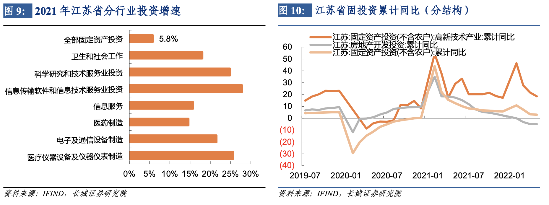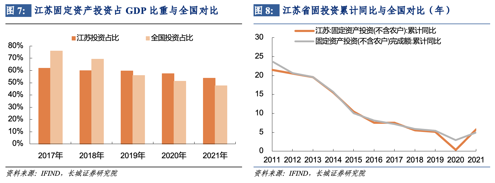 江蘇省投資增速的高彈性可能與其偏重製造業及服務業的投資結構有關。江蘇統計局指出,2021年製造業投資支撐有力,全年製造業投資增長16.1%,高於全部投資10.3個百分點。與江蘇高端製造業生產旺盛一致的,江蘇省高技術產業投資增速也在高位,2021年同比達21.6%,高於全部投資15.8個百分點,拉動全部投資增長3.5個百分點。今年前六月,江蘇省投資結構穩中向好,製造業投資累計同比增長11.4%,高於全部投資8.1個百分點。其中高技術製造業、高技術服務業投資同比分別增長14.4%、2.1%。