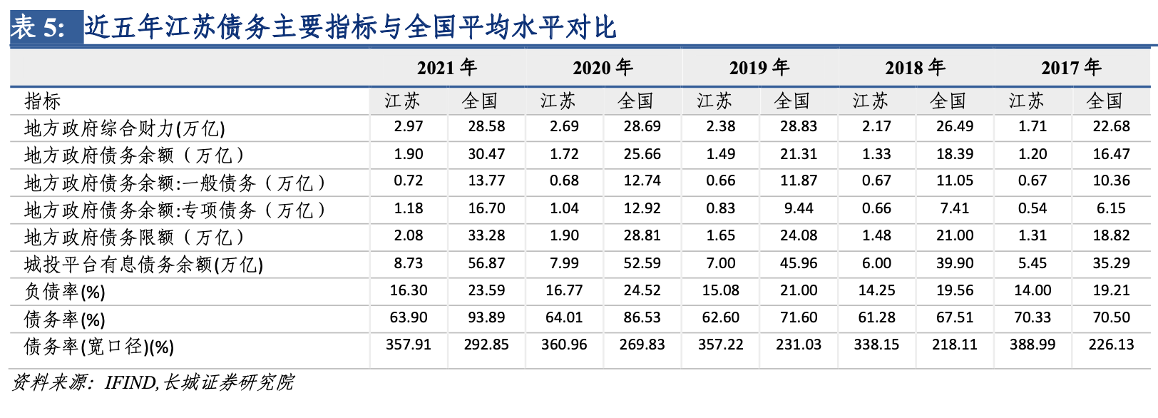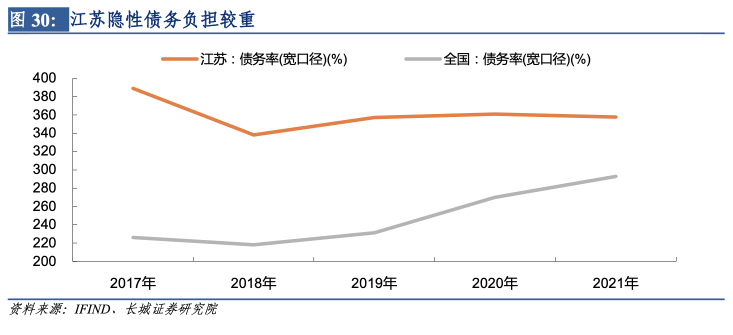 但將城投債余額也納入債務后,江蘇寬口徑債務率處於較高水平。據同花順統計數據,江蘇省城投平臺有息債務余額從2017年的5.45萬億上升至2021年的8.73萬億,年均增速達9.9%,近五年江蘇城投債務余額佔全國比重在15%以上。江蘇省近五年寬口徑債務率持續在350%左右,2021年為357.9%,高於全國各省平均的292.8%,在31個省、直轄市中排第12位,折射出江蘇省地方政府隱性債務負擔較重。