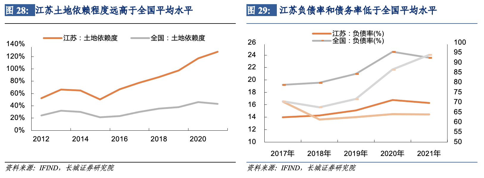 雖然江蘇省財政實力較強,但也存在一些問題,如財政對土地依賴程度較高,債務負擔偏重。我們以土地出讓收入/一般公共預算收入作為表現土地依賴程度的指標,江蘇省土地依賴度自2015年以來呈現較快的上升趨勢,2021年江蘇省土地依賴度高達127.7%,遠高於全國的43%。
