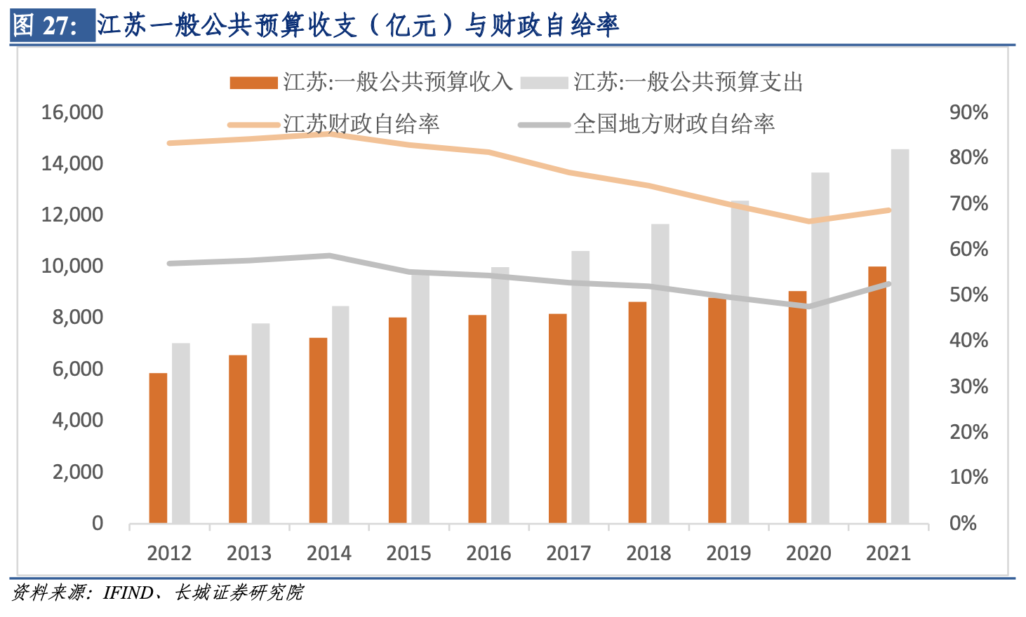 江蘇省經濟實力靠前,財政收入也非常亮眼。一般公共預算收入由2012年的5860.7億元增加至2021年的10015.2億元,年均增長6.1%;一般公共預算支出由7027.7億元增加至14586億元,年均增長8.5%。今年前6個月,江蘇省實現一般公共預算收入4639億元,比去年同期下降17.9%。以一般公共預算收入佔支出比例衡量財政自給率,江蘇省財政自給率近5年有明顯下滑,但仍遠高於全國水平,2021年財政自給率為68.7%。