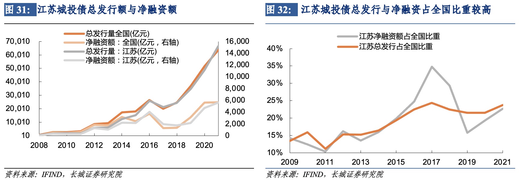 2009年,全國城投債總發行量完成三位數到四位數的躍升,達2688億元,此后城投債蓬勃發展,發行規模快速增長,2021年全國城投債發行量達32851.6億元,複合年均增速達30.2%。江蘇省城投債的發行速度比全國更快,發行總量從2009年的359億元快速上漲至2021年的15177億元,年均增速達36.6%。江蘇省城投債發行額佔全國比重基本逐年上漲,從2009年佔比13.4%發展到2021年佔比23.8%。2016年以來江蘇省發行規模佔全國比重持續位於20%以上,位居全國首位。