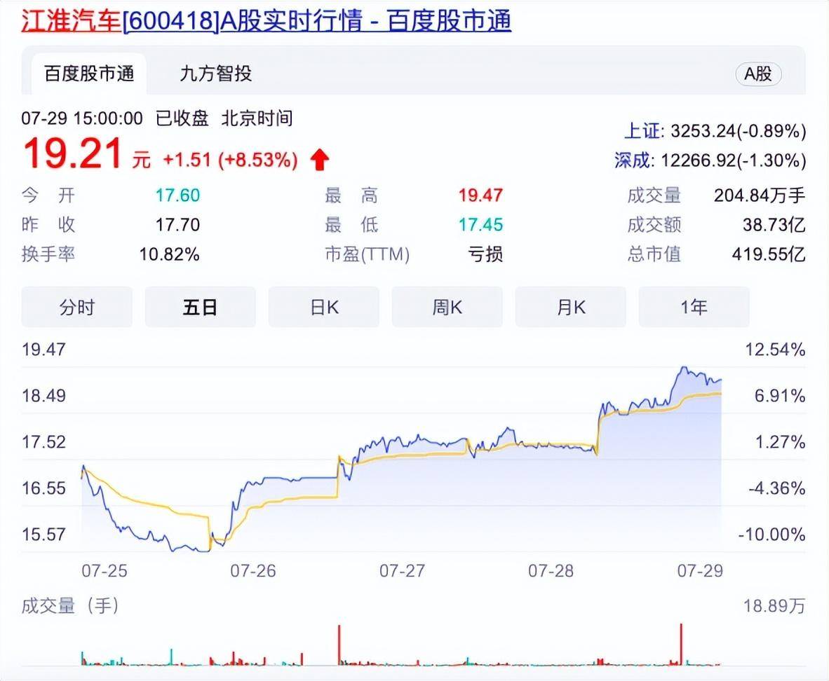 在江淮汽車午后一度漲停的帶領下,汽車整車板塊也震盪走高。截至昨日收盤,江淮汽車漲逾8%,小康股份漲逾4%,安凱客車、長安汽車漲幅均在3%以上,長城汽車上漲1.89%。