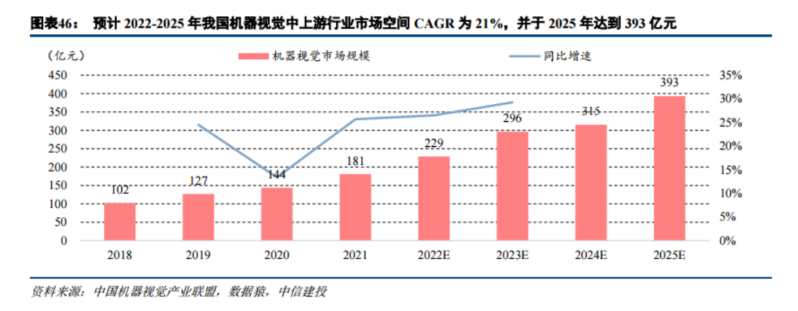 中信建投分析師呂娟2022年7月29日發佈的研報中指出,得益於宏觀經濟回暖、新基建投資增加、數據中心建設加速、製造業自動化推進等因素,預計2022-2025年中國機器視覺中上游市場空間四年CAGR為21.4%,2025年總市場空間將達到393億元。產業下游以自動化大型視覺裝備為主,產品使用場景豐富,單位價值更高,市場空間約為產業中上游的7-8倍,預計2025年中國智能視覺裝備的市場空間超3000億元。