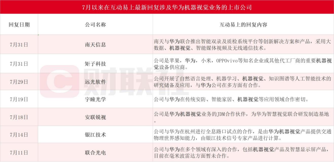 機器視覺被譽為工業人工智能皇冠上的明珠,是實現工業互聯與智能製造轉型升級的核心基礎設施。據財聯社不完全統計,7月以來南天信息、矩子科技、遠光軟件、宇瞳光學、安聯鋭視、銀江技術、聯合光電七家公司在互動易上最新回覆涉及華為機器視覺業務。