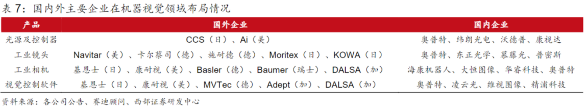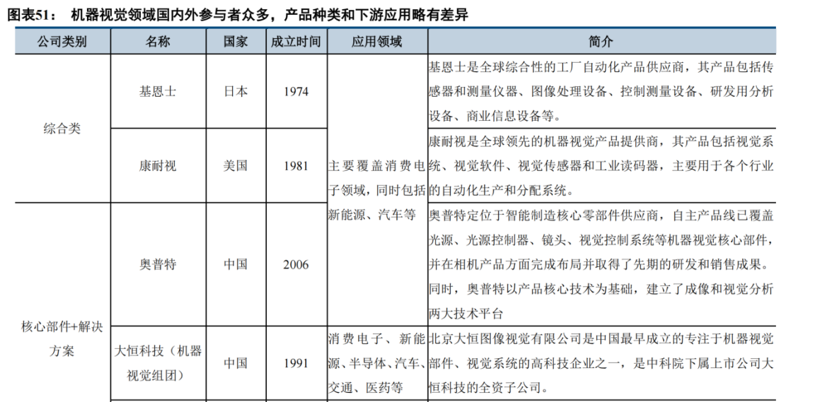 據中信建投研報梳理,機器視覺領域國內外參與者眾多,產品種類和下游應用略有差異,這些上市公司有所佈局。
