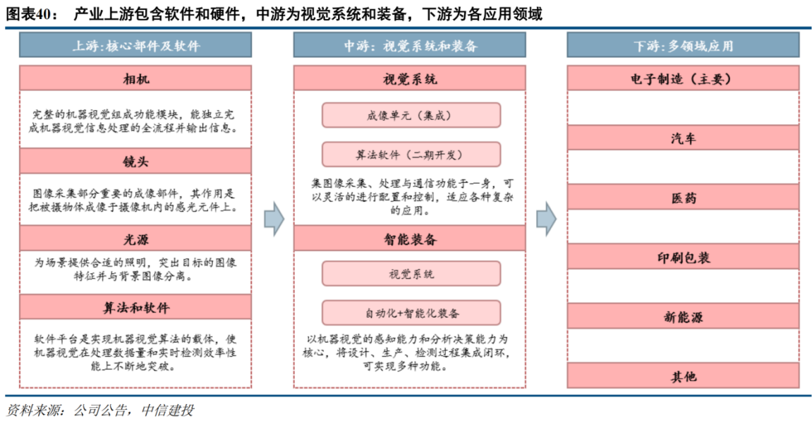 產業鏈方面,呂娟指出,產業上游包含軟、硬件零部件,中游以視覺系統和智能裝備為主,下游應用領域以電子製造為主,同時包含汽車、醫藥、印刷包裝、新能源等行業。