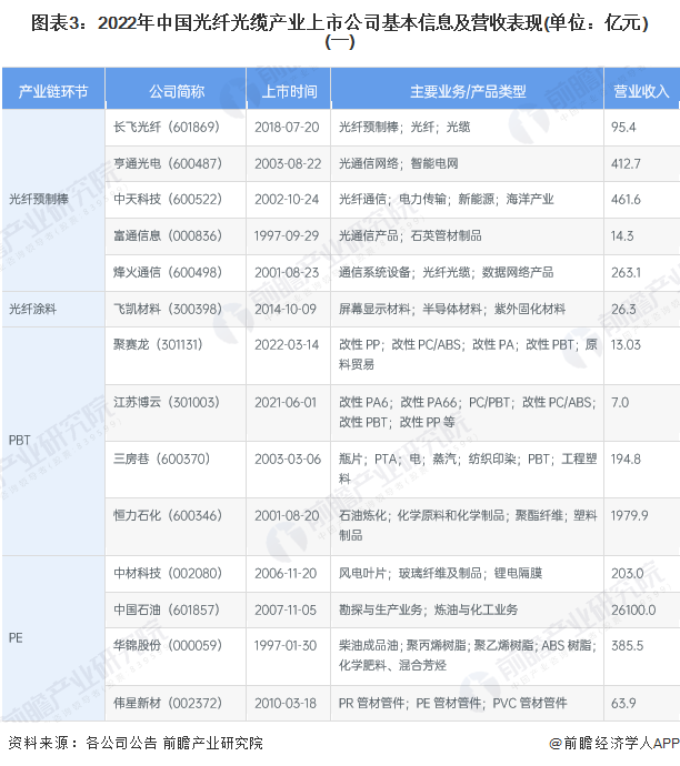 從光纖光纜產業上市企業分佈來看,在上游光纖預製棒環節中,主要為頭部光纖光纜企業擁有該產品產能,如長飛光纖和中天科技等,其他材料如光纖塗料和PBT等,主要為化學和新材料企業負責生產;中游光纖光纜代表製造企業主要有亨通光電、富通信息、長飛光纖、特發信息、中天科技和通光線纜等。