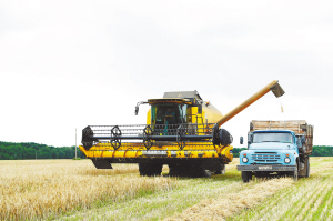 7月30日,收割機在烏克蘭切爾尼戈夫州一座農場收割麥子。新華社發