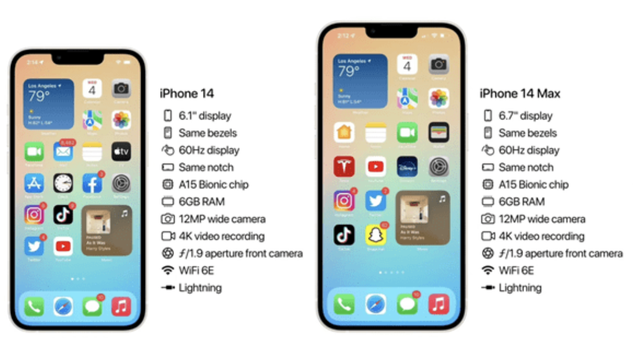 根據9to5Mac的消息,iPhone 14 與 13 一樣,依然會有四款機型,型號分別是: iPhone14、iPhone 14 Pro、iPhone 14 Max(也有説叫14 Plus)、iPhone 14 Pro Max。其中,iPhone 14 和 iPhone 14 Pro的屏幕為6.1英寸,而iPhone 14 Max和iPhone 14 Pro Max是6.7英寸。顯然,12和13兩代的mini系列被取消了,取而代之的是iPhone 14 Max。