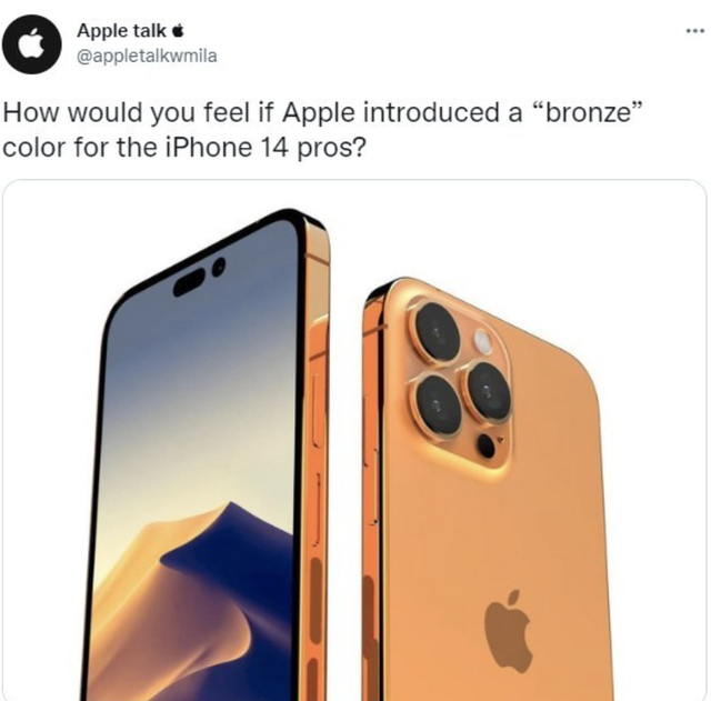 最近兩年特別喜歡玩色彩的蘋果,預計也將在新一代iPhone里引入新色彩。就目前已知的傳聞,古銅色14 Pro的渲染圖被國外消息人士曝光,比以往所有的金色都更深一些,類似於黃銅的顏色。更早的傳聞則稱,14 Pro會增加紫色。
