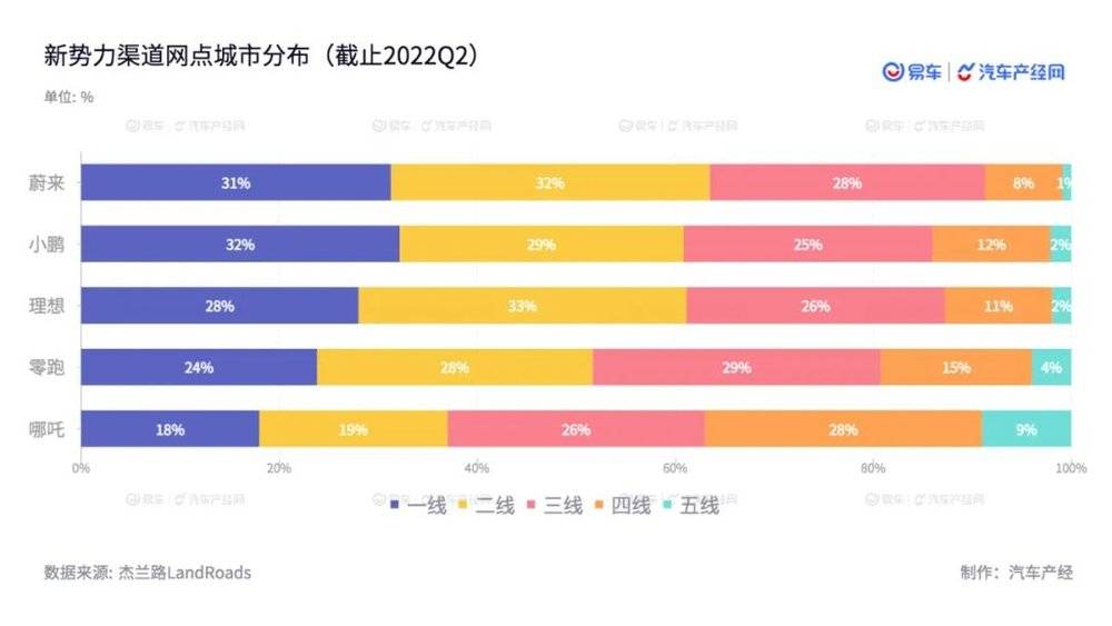 哪吒與零跑覆蓋了最多的城市,但渠道結構也以二、三、四線城市為主,超過7成。