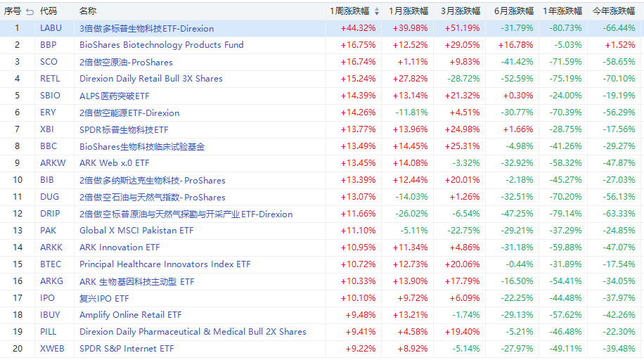 從ETF周漲幅榜看,做多生物科技類ETF成最大贏家。漲幅第一是3倍做多標普生物科技ETF $LABU ,周累計上漲44.32%;其次是BioShares生物科技產品ETF $BBP ,周累漲16.75%。