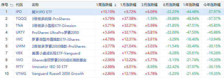 主要股指ETF方面,本周復興IPO ETF$IPO漲幅第一,周累計上漲10.10%。從ETF追蹤的指數來看,復興IPO指數本周累計收漲10.12%。漲幅排名第二是3倍做多納指ETF$TQQQ ,周累漲5.79%。