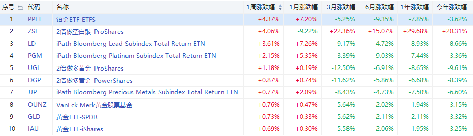 本周商品ETF漲幅榜中,鉑金ETF$PPLT漲幅第一,周累計上漲4.37%;其次是2倍做空白銀ETF$ZSL,周累計上漲4.06%。多隻做多黃金ETF也錄得漲幅。