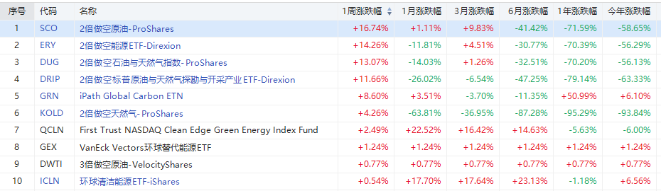本周能源ETF方面,做空類ETF漲幅領先;其中2倍做空原油ETF$SCO 位列首位,周累計上漲16.74%;其次是2倍做空能源ETF$ERY ,周累漲14.26%;2倍做空石油與天然氣指數ETF $DUG 亦表現優異,周累漲13.07%。