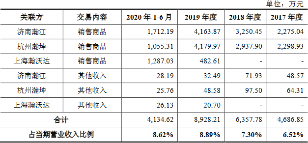 2017年至2020年,南方路機的關聯銷售金額分別為4,686.85萬元、6,357.78萬元、8,928.21萬元、14,841.35萬元,佔當期營業收入的比例分別為6.52%、7.30%、8.89%、13.00%,關聯銷售對象分別為濟南瀚江、杭州瀚坤、上海瀚沃達。