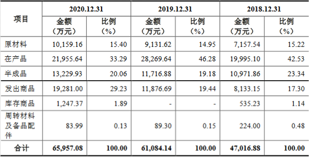 2017年末、2018年末、2019年末和2020年末,南方路機存貨賬面價值分別為31,897.22萬元、47,016.88萬元、61,084.14萬元和65,957.08萬元,佔流動資產的比例分別為38.79%、46.92%、57.20%和51.48%;存貨跌價準備金額分別為1,431.96萬元、1,472.46萬元、1,812.16萬元和1,830.45萬元,佔各期末存貨余額的比例分別為4.30%、3.04%、2.88%和2.70%。