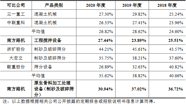 2017年至2020年,南方路機工程攪拌設備毛利率分別為25.51%、23.89%和20.77%,三一重工和中聯重科同類業務毛利率平均值分別為21.27%、24.60%、28.62%和26.82%;南方路機原生骨料加工處理設備毛利率分別為36.52%、36.72%、37.02%和30.94%,浙礦股份、大宏立和鞍重股份同類業務毛利率平均值分別為40.68%、40.66%、38.82%和35.62%。
