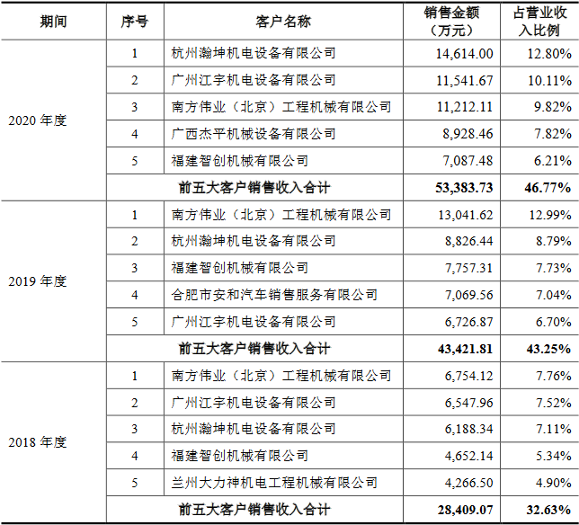 2017年至2020年,南方路機向前五大客户的產品銷售金額分別為23,096.26萬元、28,409.07萬元、43,421.81萬元和53,383.73萬元,佔營業收入的比例分別為32.11%、32.63%、43.25%和46.77%。