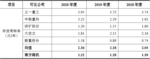 2017年末、2018年末、2019年末和2020年末,南方路機存貨周轉率分別為1.72次/年、1.50次/年、1.28次/年和1.22次/年;同行業可比上市公司存貨周轉率平均值分別為1.88次/年、2.03次/年、2.18次/年和2.36次/年。