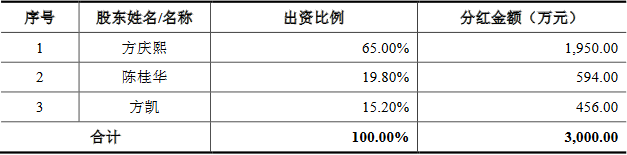 2019年11月15日,南方路機召開股東會,一致同意向全體股東分配利潤12,040.00萬元,具體分配金額依照其持股比例計算確定。其中,方慶熙、陳桂華和方凱分別分紅7,826.00萬元、2,383.92萬元和1,830.08萬元,3人累計分紅金額12,040.00萬元。