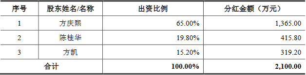 2018年12月10日,南方路機召開股東會,一致同意向全體股東分配利潤2,100.00萬元,具體分配金額依照其持股比例計算確定。其中,方慶熙、陳桂華和方凱分別分紅1,365.00萬元、415.80萬元和319.20萬元,3人累計分紅金額2,100.00萬元。