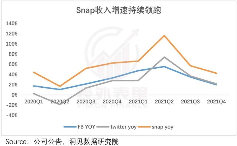 行業景氣度催化,疊加自身運作,Snap 2021年的收入增速,領跑一眾社交巨頭。