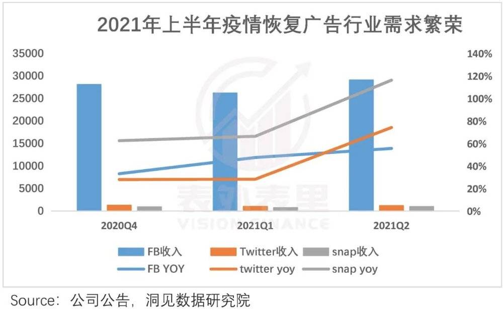 其中,Snap的增速最快。如下圖,2021Q2 Snap同比增長116%;相比之下,Twitter同比增長74%,Facebook則僅有56%。