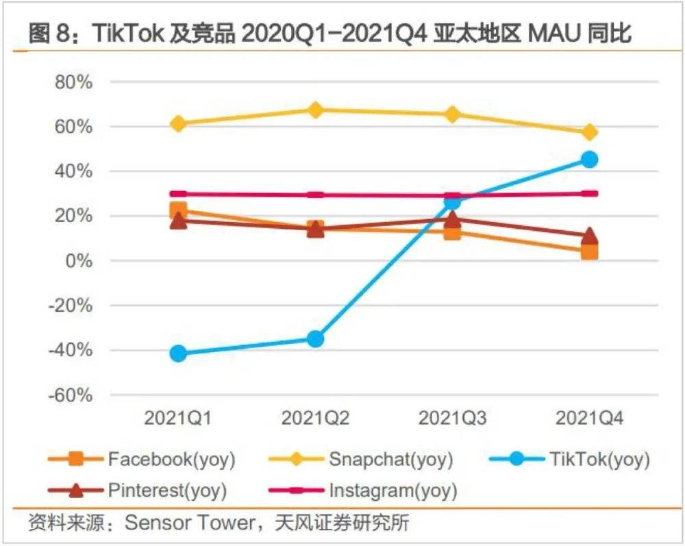 且北美市場的數據來看,2021Q4北美地區,Snap和TikTok是唯二MAU同比增速向上的社交平臺。