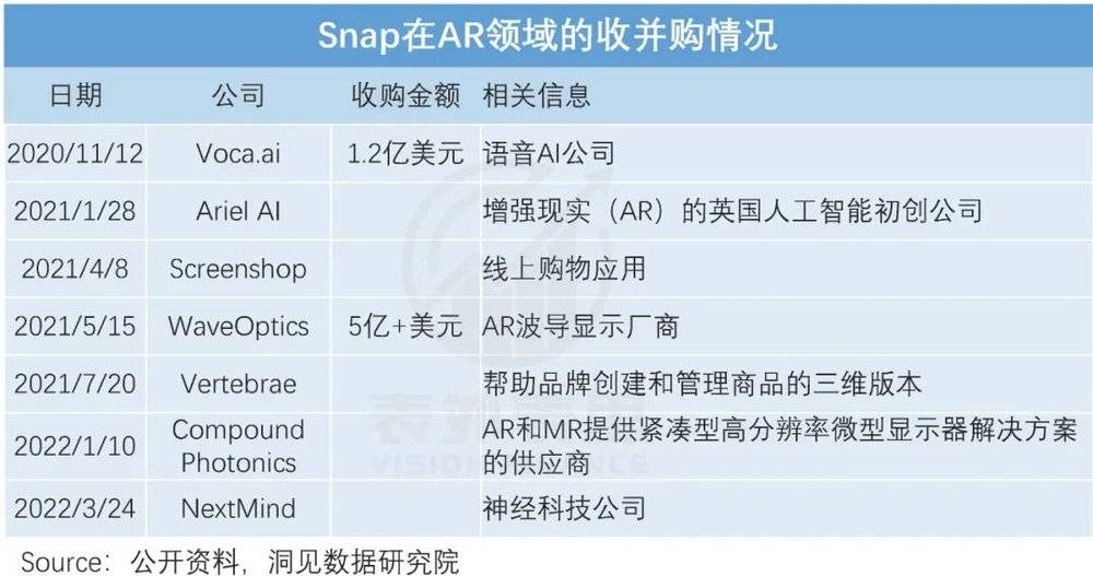 但Snap的領先優勢,並不穩定。爲了實現彎道超車,Snap瘋狂「買買買」。一年多時間,收購了七家AR相關公司(不完全統計),覆蓋算法、變現、硬件等領域。