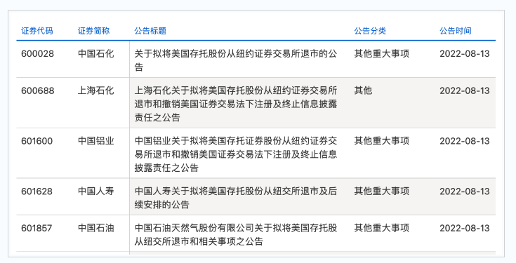 昨天盤后,中國石油化工股份有限公司、中國石油天然氣股份有限公司、中國鋁業股份有限公司、中國人壽保險股份有限公司、中國石化上海石油化工股份有限公司等五家中國企業同時發佈公告,擬將美國存托股份從紐約證券交易所退市。