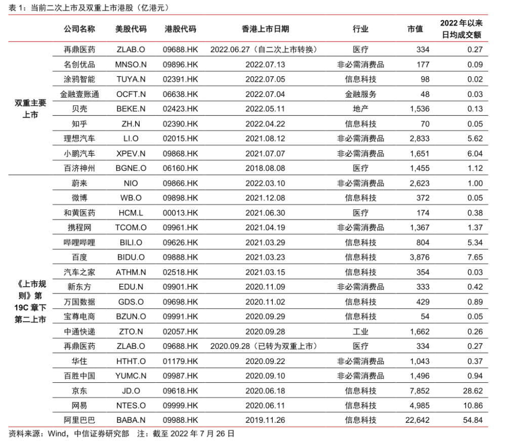 截止7月25日,在港股、美股雙重上市的中概股有貝殼、知乎、理想汽車、小鵬汽車、百濟神州等,二次上市的有阿里巴巴、網易、京東、新東方、蔚來等。所謂雙重上市是指美股、港股均為主要上市地,所謂二次上市是指在港股發行存託憑證,美股是主要上市地。